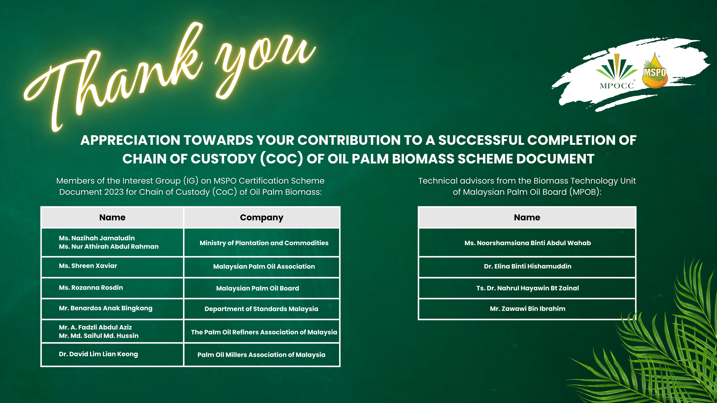 On behalf of the Board of Trustees and the management of MPOCC, we would like to extend our heartfelt appreciation and gratitude for your invaluable contributions as part of the technical advisory committee for the development of MSPO Certification Scheme document, Chain of Custody (CoC) of Oil Palm Biomass 2024.