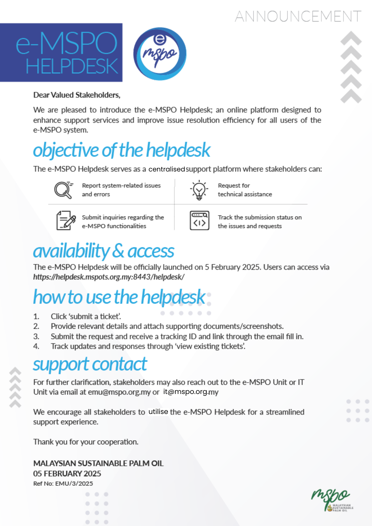 We are pleased to introduce the e-MSPO Helpdesk to assist our stakeholders. This helpdesk serves as a platform to provide support services and improve issue resolution efficiency for our e-MSPO users.