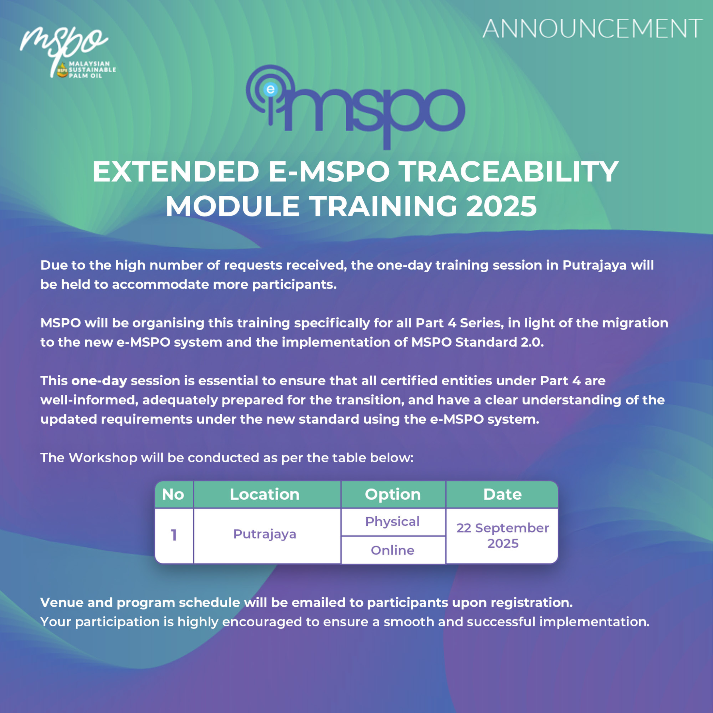 This training is specifically organised for all Part 4 Series certified entities, in preparation for the migration to the new e-MSPO system and the implementation of MSPO Standard 2.0.