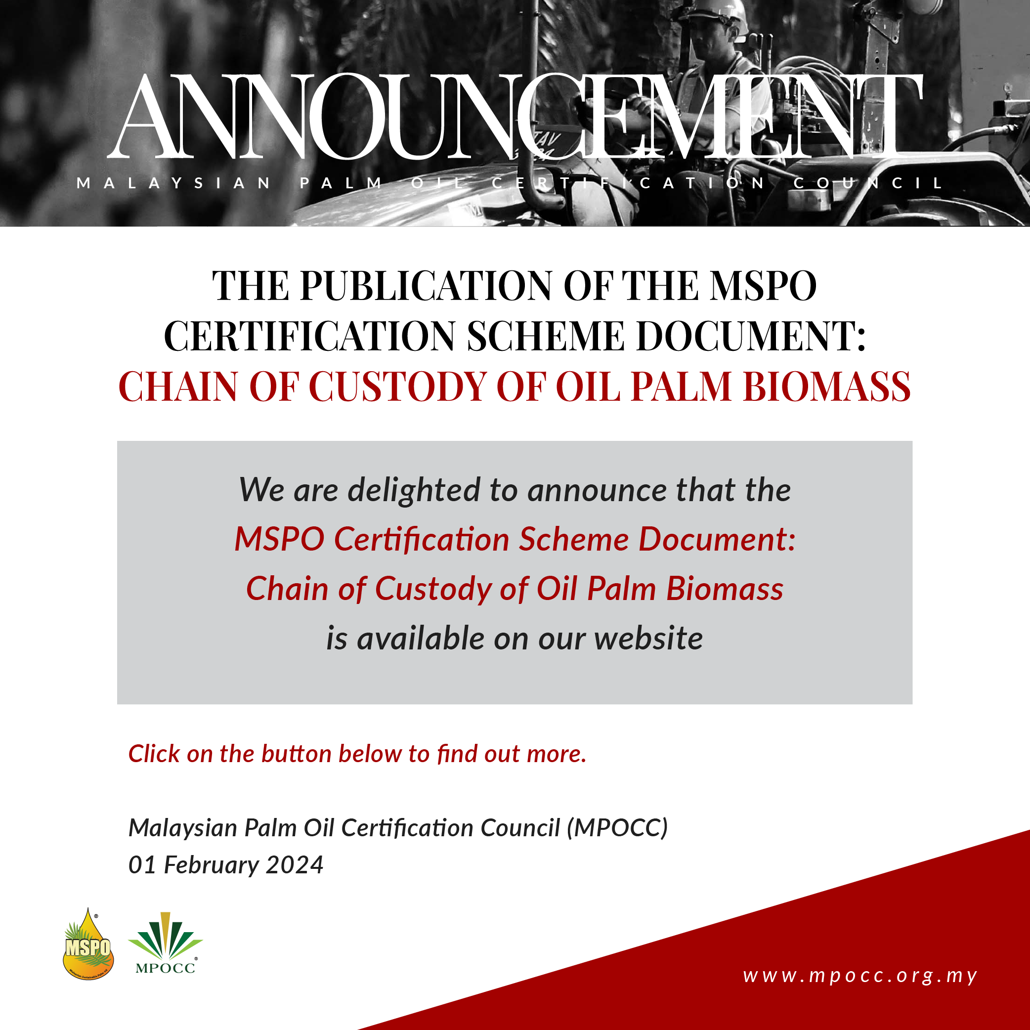 We are delighted to announce that the MSPO Certification Scheme Document: Chain of Custody of Oil Palm Biomass is available on our website