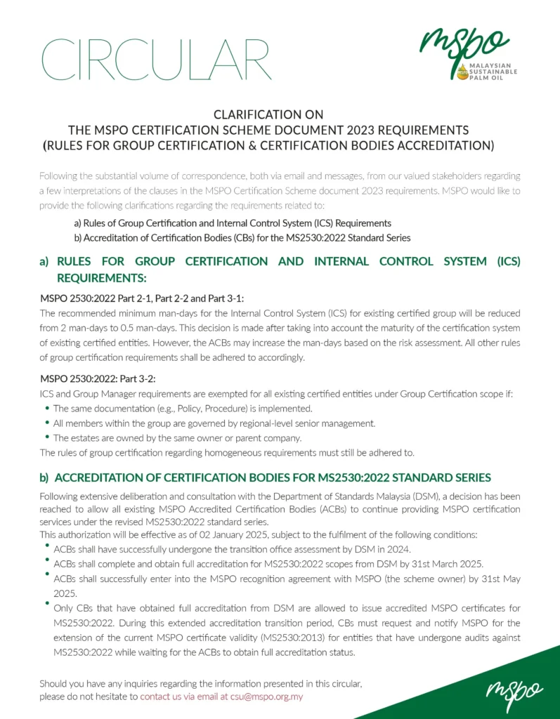 Circular - Clarification on the MSPO Certification Scheme document 2023 requirements. During this transitional phase, MSPO will proactively address stakeholder inquiries and concerns pertaining to the MSPO certification scheme requirements through the issuance of regular ad-hoc circulars.