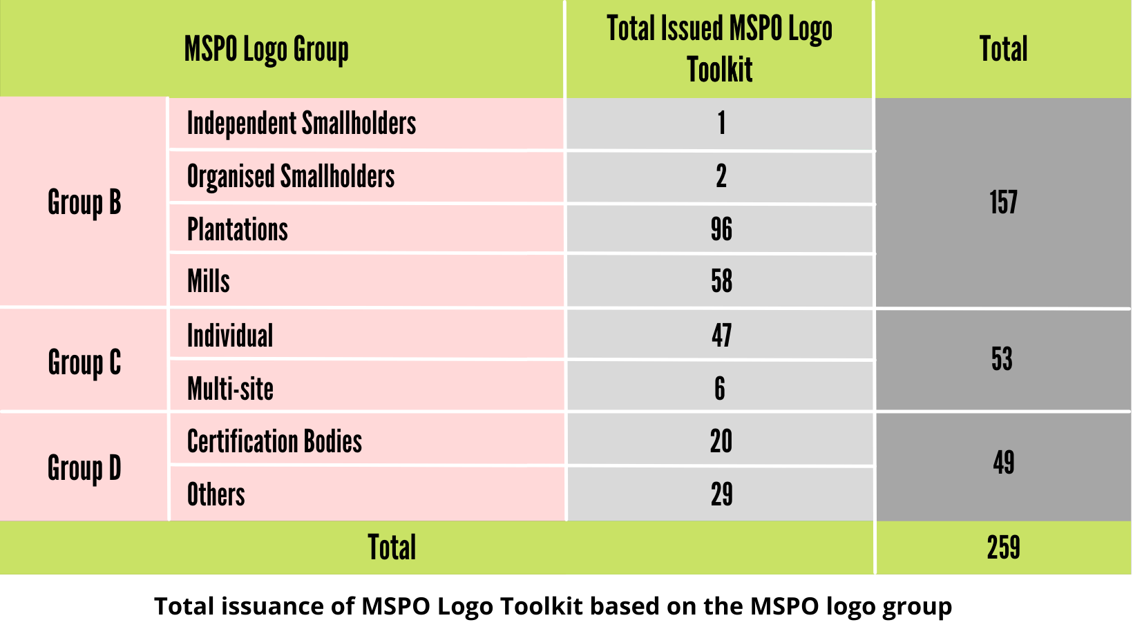 As of 31 December 2021, MPOCC has issued a total of 259 MSPO Logo Toolkit or MSPO Logo Users.
