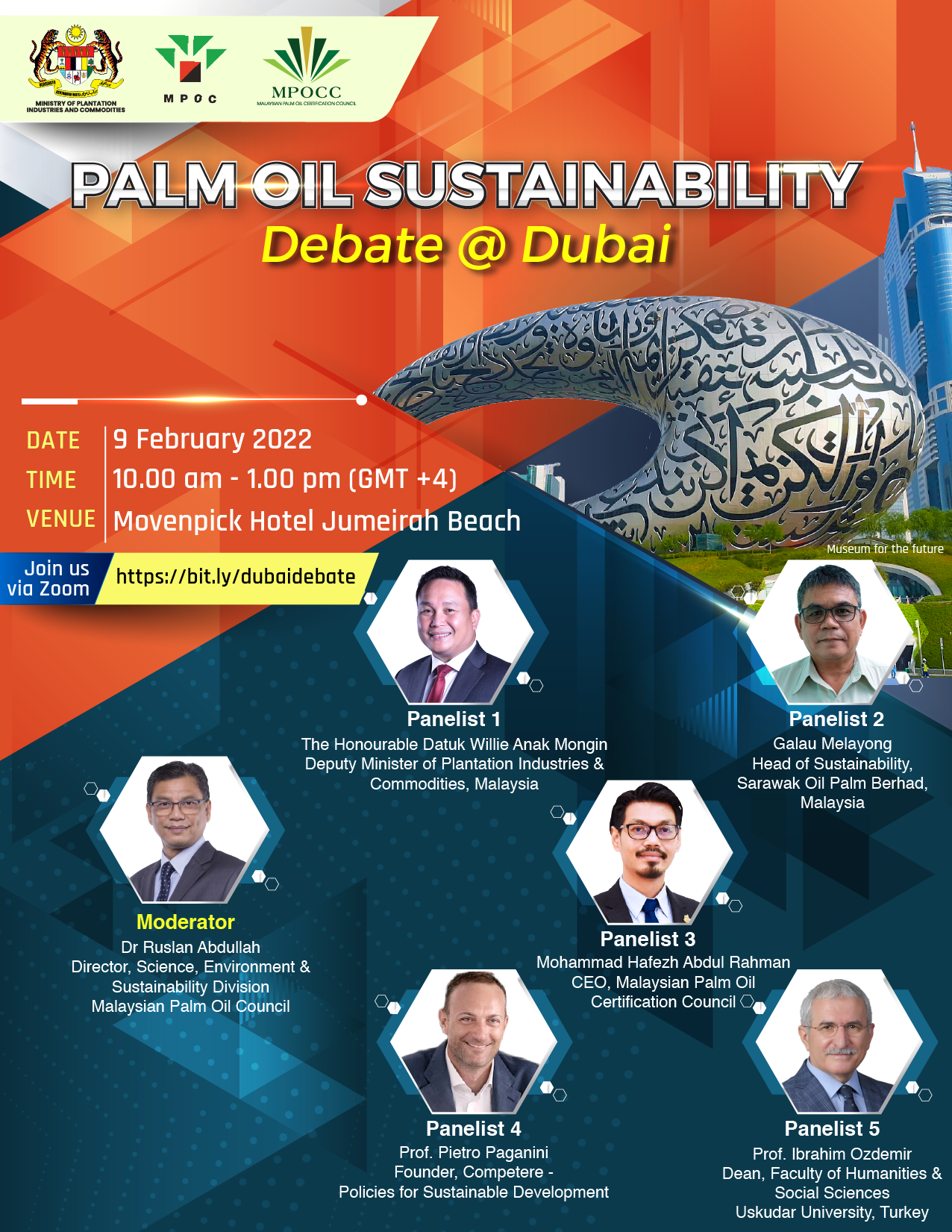 In line with the Malaysian Pavilion theme, “Exploring Sustainable Agricommodity” MPOCC partners with Malaysian Palm Oil Council (MPOC) in organising a Palm Oil Sustainability Debate session that explores the current and emerging sustainability challenges and opportunities in the palm oil industry globally. The hybrid session will discuss the different viewpoints of stakeholders on topics driving sustainability from four esteemed panellists, which will present topics like: